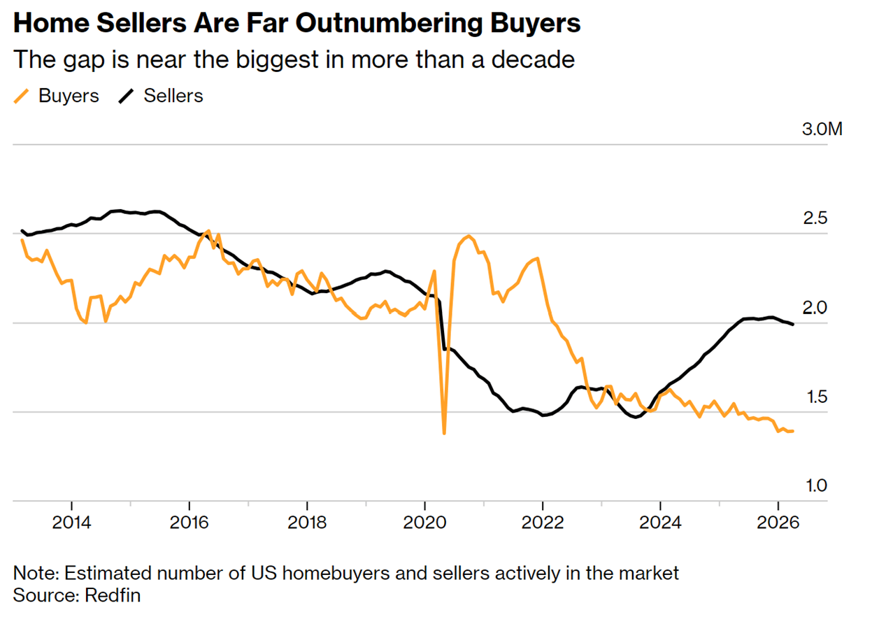 The macroeconomic fallout from the ongoing conflict and persistent inflation is increasingly visible in the behavior of US consumers. Consumer sentiment fell to a record low in April, reflecting deep-seated worries about the economic consequences of the Iran war. This trepidation is particularly evident in the US housing market, which is currently experiencing a period of profound dysfunction. Despite a theoretical shift toward a buyer’s market—with sellers now outnumbering buyers by 43%—actual transactions have remained muted. Pending home sales fell 1.1% in March compared to the previous year, as high mortgage rates and job security concerns keep prospective buyers on the sidelines.