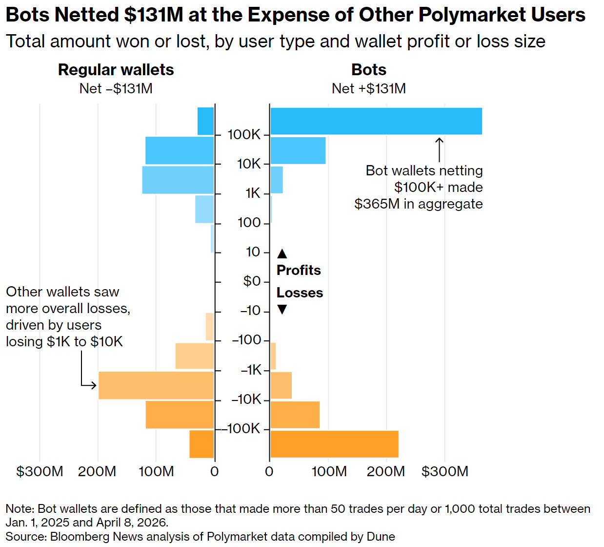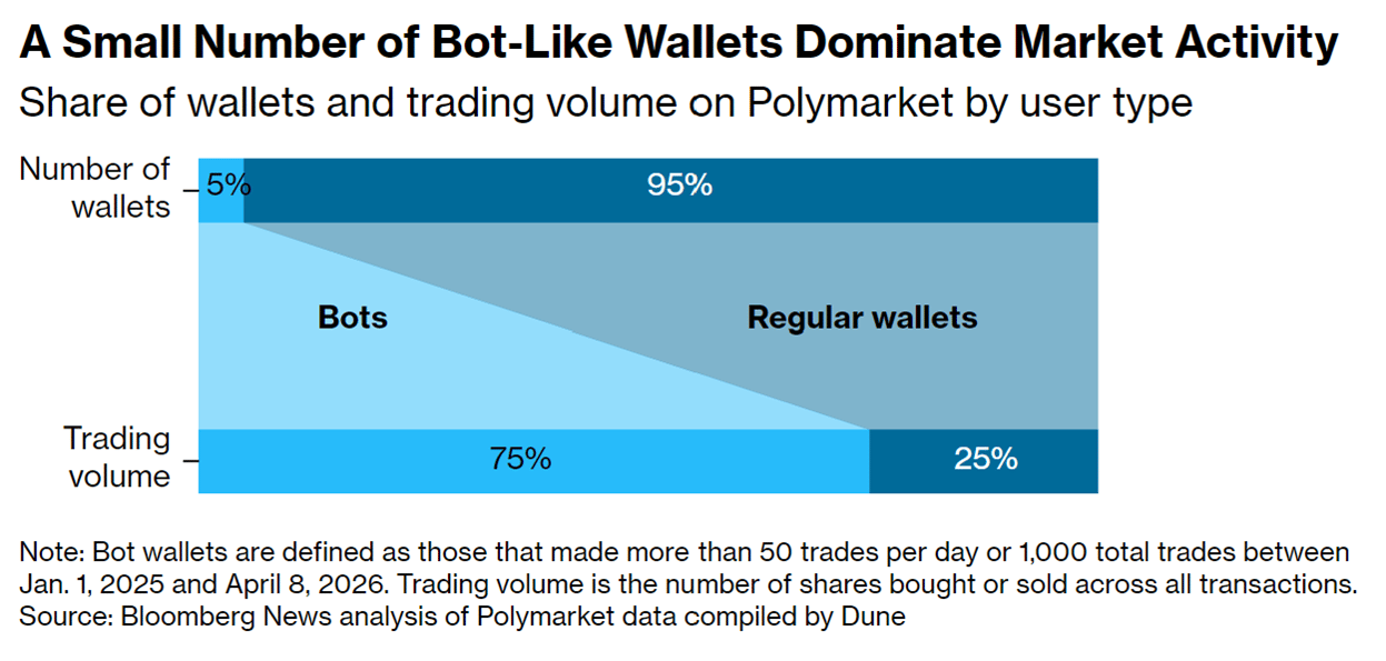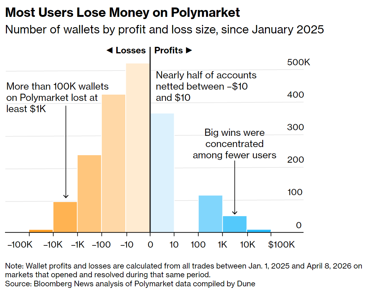Beyond traditional equities, a detailed analysis of prediction markets like Polymarket has revealed a stark reality for retail participants. While these markets are often marketed as a lucrative side hustle for younger Americans, a Bloomberg News analysis shows that most traders are losing money. Since the beginning of 2025, over 100,000 accounts have lost at least $1,000, nearly twice the number that made an equivalent profit. The data suggests that the gains in these markets are heavily concentrated among a small number of automated bots. These high-frequency traders, which average 89 trades per day compared to just 2.2 for human users, have collectively netted a profit of $131 million. Interestingly, while retail traders actually pick the correct outcome more frequently than bots, they lose money because they lack the execution edge, often trading late and at inferior prices.